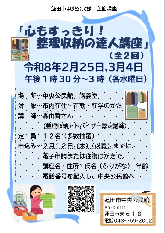 心もすっきり! 整理収納の達人講座に参加し、お部屋をすっきりして暮らしの整理をしませんか。