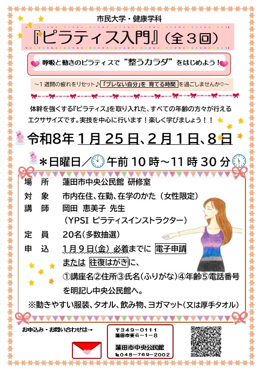 1月9日金曜日までに(必着)、電子申請または往復はがきに、講座名・住所・氏名(ふりがな)・年齢・電話番号を明記し、中央公民館へ